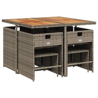 This garden dining set is a great choice for al fresco dining or just relaxing in the garden, backyard, or on the patio. Durable material: PE rattan, also known as poly rattan, is a strong, low-maintenance synthetic material that looks like natural rattan. It's lightweight, easy to clean, and commonly used for outdoor furniture due to its durability and weather-resistant properties.Compact storage: These chairs have a flap backrest that can be folded down, making it easy to store them under the table. When folded, they neatly fit under the table, forming a space-saving cube shape. Additionally, the stools can also be stored under the chairs, further maximizing space efficiency.Comfortable seat experience: This outdoor furniture, complete with thickly padded cushions, offers a comfortable seating experience.Removable and washable cover: These seat cushions feature removable covers for easy washing and maintenance. The chair cushion covers have a flap at the back for easy attachment to the chairs.Stable and easy-to-clean tabletop: This garden table has an acacia wood top that is sturdy, durable, and easy to clean with a damp cloth. Good to know: To make sure your outdoor furniture stays beautiful, we recommend protecting it with a waterproof cover.