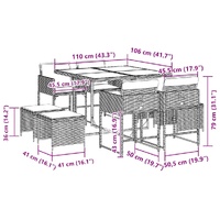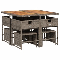 This garden dining set is a great choice for al fresco dining or just relaxing in the garden, backyard, or on the patio. Durable material: PE rattan, also known as poly rattan, is a strong, low-maintenance synthetic material that looks like natural rattan. It's lightweight, easy to clean, and commonly used for outdoor furniture due to its durability and weather-resistant properties.Compact storage: These chairs have a flap backrest that can be folded down, making it easy to store them under the table. When folded, they neatly fit under the table, forming a space-saving cube shape. Additionally, the stools can also be stored under the chairs, further maximising space efficiency.Comfortable seat experience: This outdoor furniture, complete with thickly padded cushions, offers a comfortable seating experience.Removable and washable cover: These seat cushions feature removable covers for easy washing and maintenance. The cushion covers have a flap at the back for easy attachment to the backrests.Stable and easy-to-clean tabletop: This garden table has an acacia wood top that is sturdy, durable, and easy to clean with a damp cloth. Good to know: To make sure your outdoor furniture stays beautiful, we recommend protecting it with a waterproof cover.