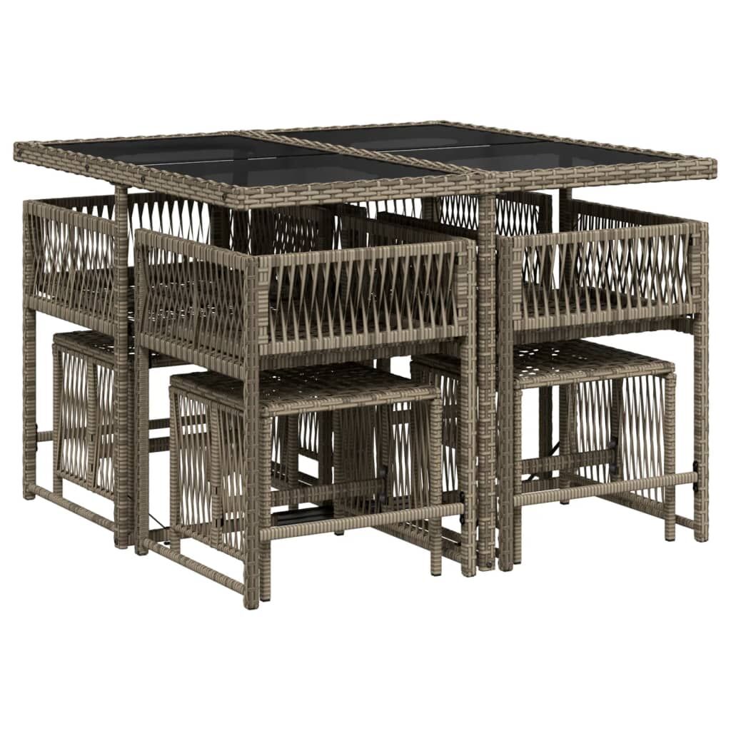 This garden dining set is a great choice for al fresco dining or just relaxing in the garden, backyard, or on the patio. Durable material: PE rattan, also known as poly rattan, is a strong, low-maintenance synthetic material that looks like natural rattan. It's lightweight, easy to clean, and commonly used for outdoor furniture due to its durability and weather-resistant properties.Compact storage: These chairs have a flap backrest that can be folded down, making it easy to store them under the table. When folded, they neatly fit under the table, forming a space-saving cube shape. Additionally, the stools can also be stored under the chairs, further maximizing space efficiency.Comfortable seat experience: This outdoor furniture, complete with thickly padded cushions, offers a comfortable seating experience.Removable and washable cover: These seat cushions feature removable covers for easy washing and maintenance. The cushion covers have a flap at the back for easy attachment to the backrests.Glass tabletop: The outdoor table's top is made from strong and durable tempered glass, making it easy to clean with a damp cloth and adding a touch of elegance to your outdoor space. Good to know:To make sure your outdoor furniture stays beautiful, we recommend protecting it with a waterproof cover.