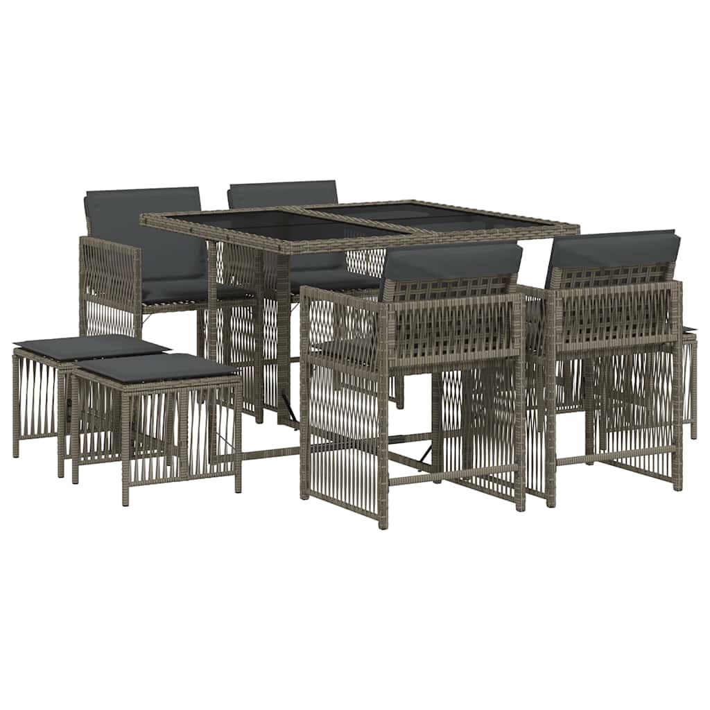 This garden dining set is a great choice for al fresco dining or just relaxing in the garden, backyard, or patio. Durable material: PE rattan, also known as poly rattan, is a strong, low-maintenance synthetic material that looks like natural rattan. It's lightweight, easy to clean, and commonly used for outdoor furniture due to its durability and weather-resistant properties.Compact storage: These chairs have a flap backrest that can be folded down, making it easy to store them under the table. When folded, they neatly fit under the table, forming a space-saving cube shape.Comfortable seat experience: This outdoor furniture, complete with thickly padded cushions, offers a comfortable seating experience.Removable and washable cover: These seat cushions feature removable covers for easy washing and maintenance. The cushion covers have a flap at the back for easy attachment to the backrests.Glass tabletop: The outdoor table's top is made from strong and durable tempered glass, making it easy to clean with a damp cloth and adding a touch of elegance to your outdoor space. Good to know:To make sure your outdoor furniture stays beautiful, we recommend protecting it with a waterproof cover.