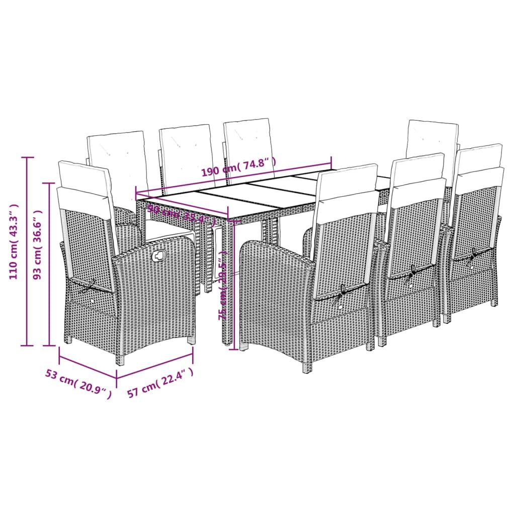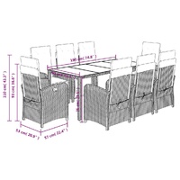 Enjoy a cup of coffee or have a chat with your family and friends in the garden, backyard, or on the balcony with this comfortable garden dining set! Durable material: PE rattan, also known as poly rattan, is a strong, low-maintenance synthetic material that looks like natural rattan. It's lightweight, easy to clean, and commonly used for outdoor furniture due to its durability and weather-resistant properties.Adjustable backrest and footrest: This garden seat has a handle. You can adjust the backrest and footrest to any position by pulling the handle, and quickly return them to their original positions.Comfortable seat experience: This outdoor furniture, complete with thickly padded cushions, offers a comfortable seating experience.Removable and washable cover: These seat cushions feature removable covers for easy washing and maintenance. The back cushions have a flap at the back for easy attachment to the backrests.Glass tabletop: The outdoor table's top is made from strong and durable tempered glass, making it easy to clean with a damp cloth and adding a touch of elegance to your outdoor space. Good to know:To make sure your outdoor furniture stays beautiful, we recommend protecting it with a waterproof cover.