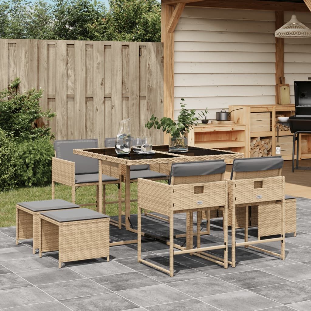 This garden dining set is a great choice for al fresco dining or just relaxing in the garden, backyard, or on the patio. Durable material: PE rattan, also known as poly rattan, is a strong, low-maintenance synthetic material that looks like natural rattan. It's lightweight, easy to clean, and commonly used for outdoor furniture due to its durability and weather-resistant properties.Compact storage: These chairs have a flap backrest that can be folded down, making it easy to store them under the table. When folded, they neatly fit under the table, forming a space-saving cube shape. Additionally, the stools can also be stored under the chairs, further maximising space efficiency.Comfortable seat experience: This outdoor furniture, complete with thickly padded cushions, offers a comfortable seating experience.Removable and washable cover: These seat cushions feature removable covers for easy washing and maintenance. The cushion covers have a flap at the back for easy attachment to the backrests.Glass tabletop: The outdoor table's top is made from strong and durable tempered glass, making it easy to clean with a damp cloth and adding a touch of elegance to your outdoor space. Good to know: To make sure your outdoor furniture stays beautiful, we recommend protecting it with a waterproof cover.