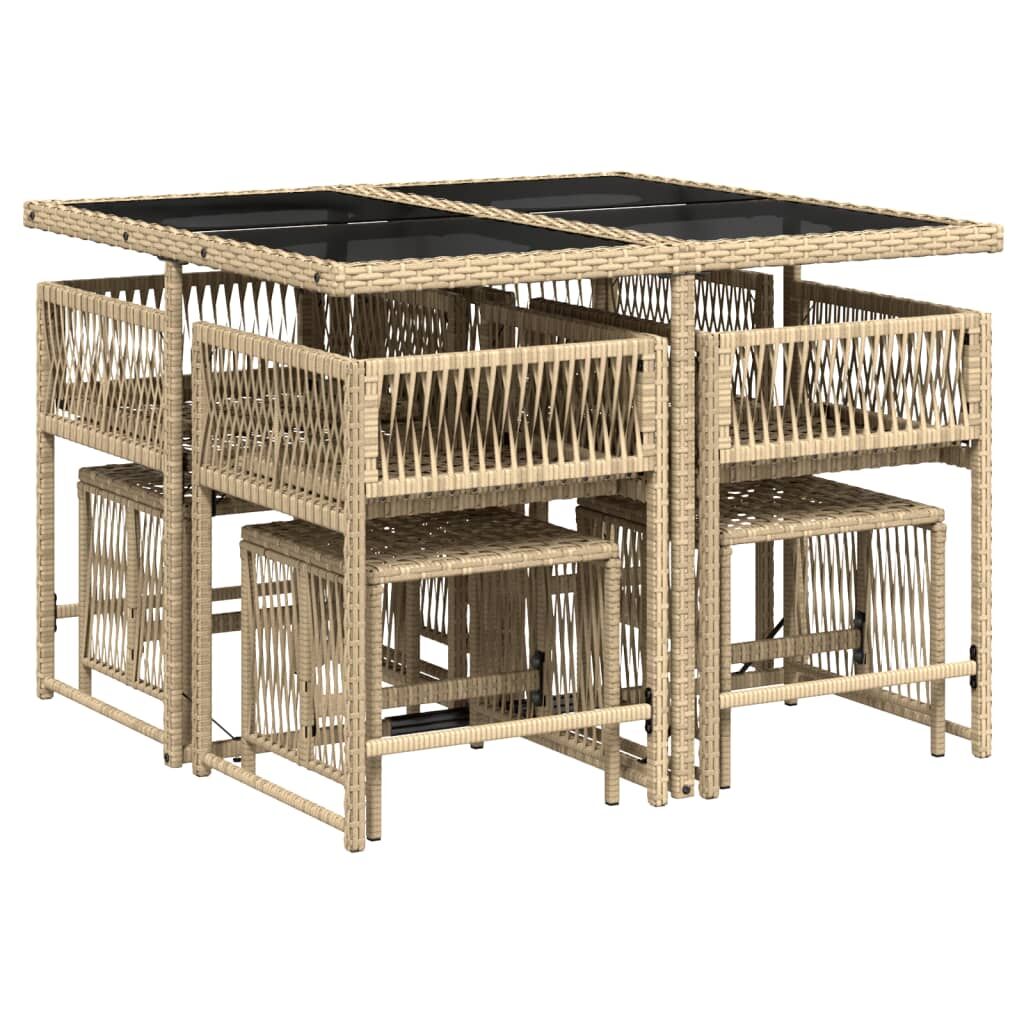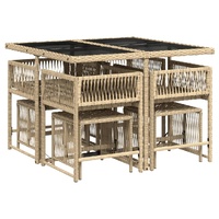 This garden dining set is a great choice for al fresco dining or just relaxing in the garden, backyard, or on the patio. Durable material: PE rattan, also known as poly rattan, is a strong, low-maintenance synthetic material that looks like natural rattan. It's lightweight, easy to clean, and commonly used for outdoor furniture due to its durability and weather-resistant properties.Compact storage: These chairs have a flap backrest that can be folded down, making it easy to store them under the table. When folded, they neatly fit under the table, forming a space-saving cube shape. Additionally, the stools can also be stored under the chairs, further maximizing space efficiency.Comfortable seat experience: This outdoor furniture, complete with thickly padded cushions, offers a comfortable seating experience.Removable and washable cover: These seat cushions feature removable covers for easy washing and maintenance. The cushion covers have a flap at the back for easy attachment to the backrests.Glass tabletop: The outdoor table's top is made from strong and durable tempered glass, making it easy to clean with a damp cloth and adding a touch of elegance to your outdoor space. Good to know:To make sure your outdoor furniture stays beautiful, we recommend protecting it with a waterproof cover.