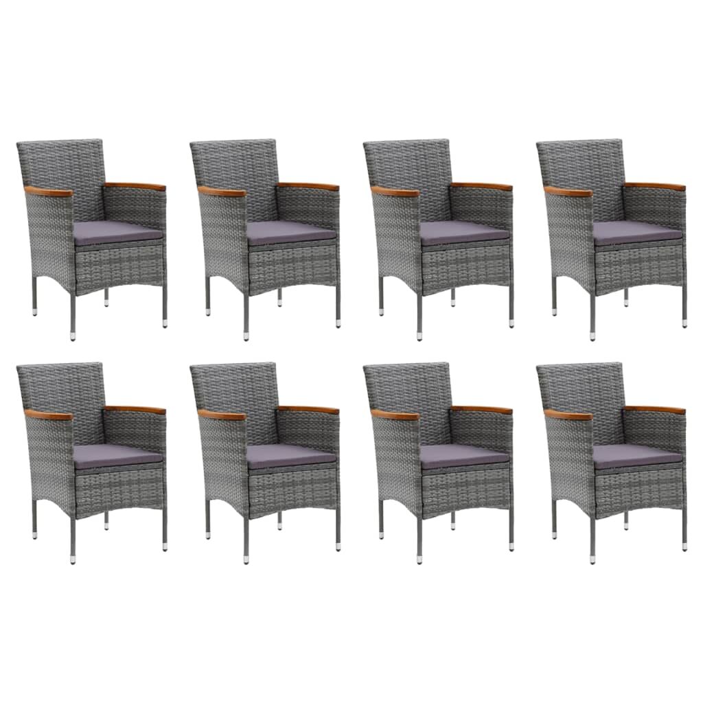 This garden dining set is a perfect combination of style and functionality and is meant to be the focal point of your garden, balcony or patio. Sturdy steel frame wrapped with weather-resistant PE rattan, the garden chairs are rust and mildew proof, providing years of quality relaxation. The armrests are beautifully decorated with solid acacia wood with a natural oil finish, which brings a sense of rustic charm. The outdoor table features a WPC tabletop, which is easy to clean and suitable for outdoor use. The aluminium frame also ensures stability and sturdiness. Additionally, the thickly padded cushions provide ultimate comfort during your sitting time. This patio dining set is easy to move with the lightweight construction. Note: In order to extend the life of your outdoor furniture, we recommend you to clean it regularly and do not leave it outdoors without protection unnecessarily.Clean: Use a mild soap solution.Storing: If possible, store in a cool, dry place indoors. If the product is stored outdoors, protect it with a waterproof cover. Wipe and dry the excess water or snow from flat surfaces after a rain or snowfall. Allow sufficient air circulation to avoid moisture-related damage.