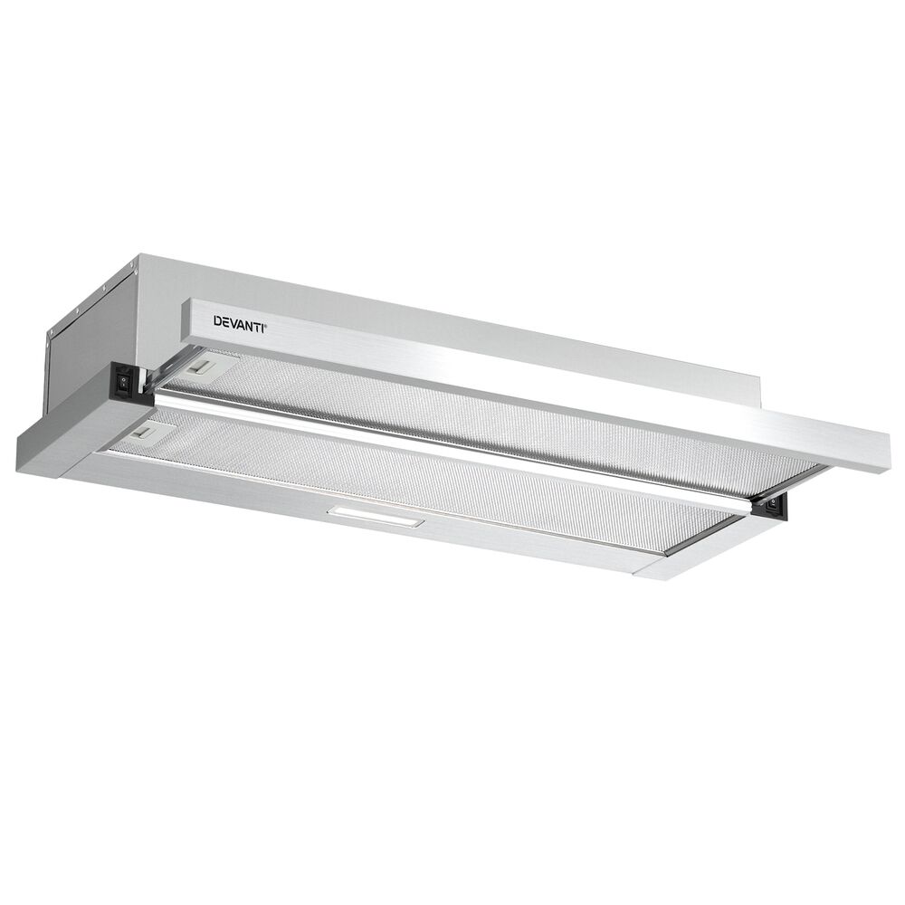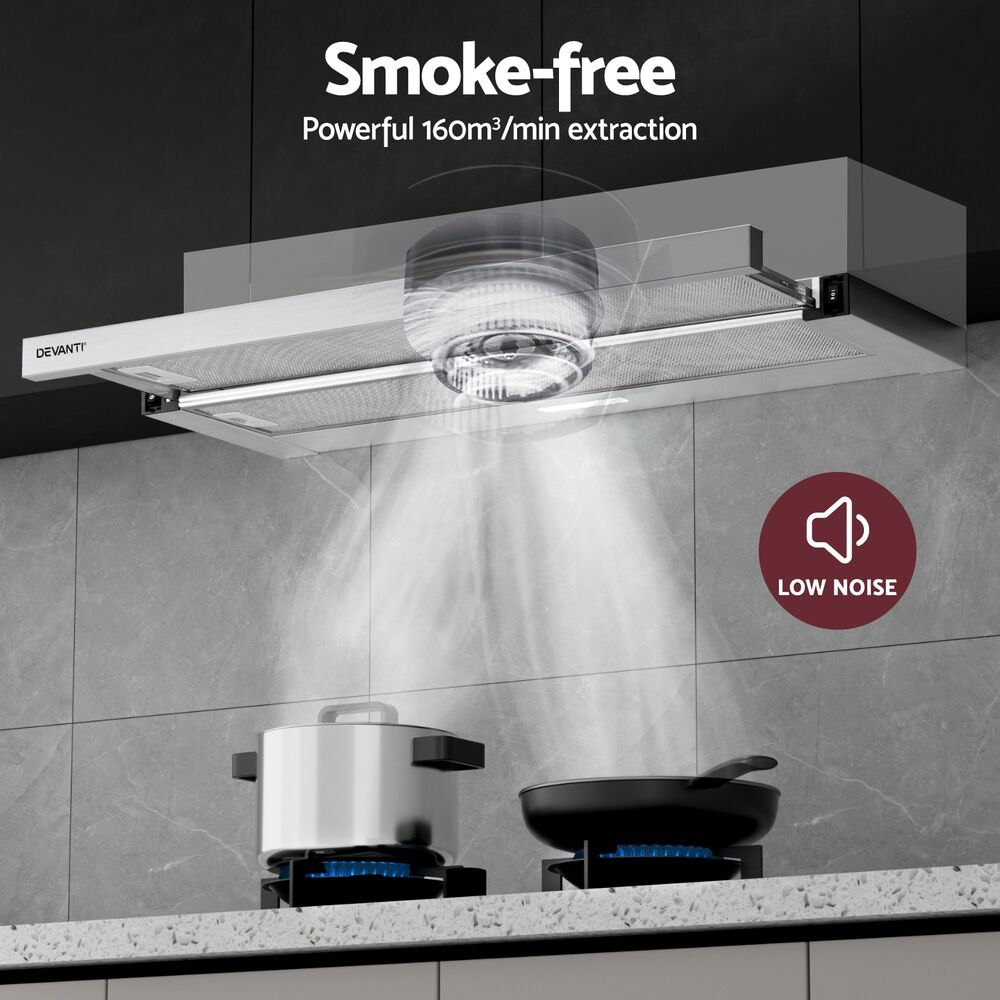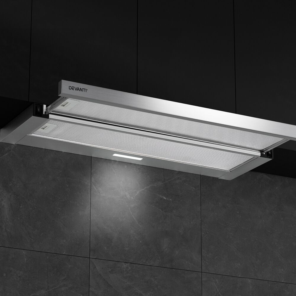 $113.73Do you suffer from stifling odours and stubborn smoke or steam from your cooking? Say goodbye to smells and stains with the Devanti 90cm Slide-out Range Hood. Made from Grade A stainless steel the range hood looks and functions perfectly for a busy kitchen. Featuring a powerful extraction rate of 160m/hr from a high-performance motor, our stainless-steel range hood will clear the air of smoke, steam, odours and vapours in no time. The non-stick and removable 3-layer aluminium grease filter ensures all grease is efficiently captured. Clear and bright LED lights provide vivid illumination for your cooking area, so you can see everything you're cooking. Completing the job is a 2-speed fan that can be easily selected with the push button controls. The range hood is easy to install and suitable for standard Australian plugs and both under-cabinet or wall-mounted installation. For clean and clear air in your home, you can't cook without a Devanti Slide-out Range Hood.