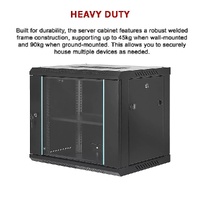 Built for durability, the server cabinet features a robust welded frame construction, supporting up to 45kg when wall-mounted and 90kg when ground-mounted. This allows you to securely house multiple devices as needed.
