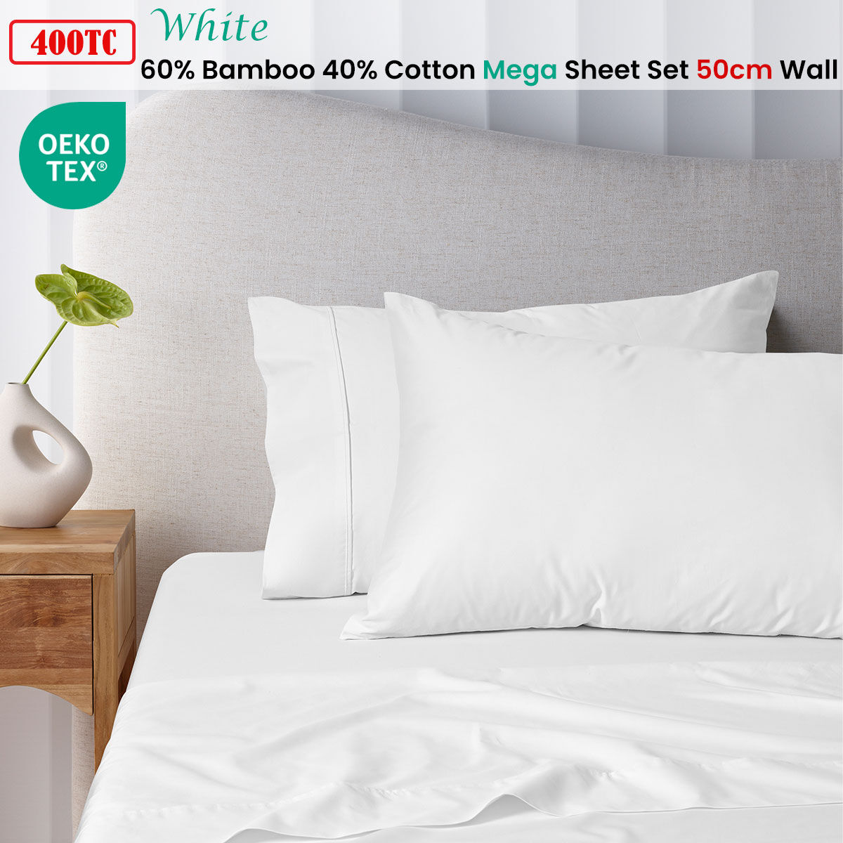 The 400TC White Bamboo Cotton Mega / Super Sheet Set 50cm Wall by Accessorize is a perfect blend of Bamboo and cotton in a luxurious 400TC sateen weave. Our sheets are a blend of 60% Bamboo and 40% cotton with a smooth, silky soft finish. Both fibres are temperature regulating and will keep you cool in summer and warm in winter. The fabric is naturally hypoallergenic and perfect for sensitive skin.
