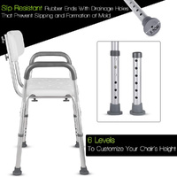 Each chair leg is capped with rubber non-slip tips for additional safety and security; Drainage holes reduce slipping or sliding on pooled water, creating a safe and comfortable shower seat