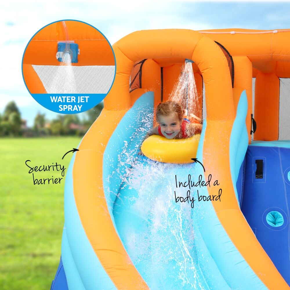 Kids water park with two slides, climbing wall and water cannon