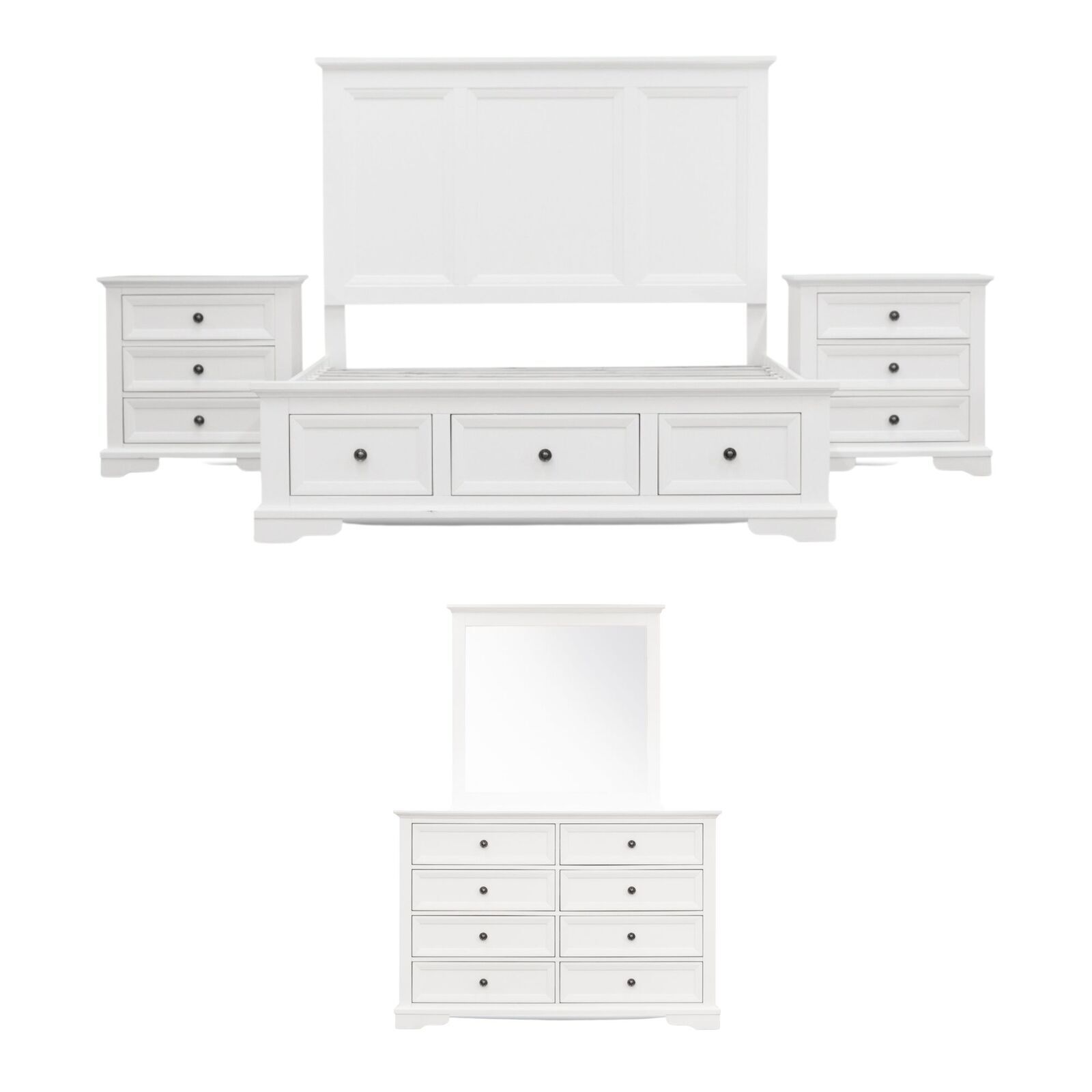 A few furniture pieces make the bedroom look grand. This queen bed, dresser-mirror suite is composed of such furniture pieces. The suite is crafted in the coastal style, and it decorates your bedroom wonderfully. Turn your bedroom into a tranquil retreat with this suite and also keep it well-organized with the help of extra storage space. The suite consists of 1 queen bed having 3 foot-end drawers, 1 dresser with 8 sizable drawers, 1 mirror, and 2 bedside tables with 3 drawers each. All the drawers are adorned with full metal extension runners and shiny black metal knobs. The top drawers have black felt for storing delicate items. The mirror is composed of top-quality annealed glass fitted into an equally beautiful wooden frame. A beautiful headboard gives a classy look to the bed, and solid pine slats give it great robustness. The whole furniture collection is made of sustainably harvested solid acacia timber. The wood is known for its good looks, strength, shock-resistance, long durability, and ease of maintenance. The suite in a white painted finish goes well with a variety of interior decor styles, and a one-year warranty is included with the suite. The best part is that only the bed needs to be assembled in the entire suite.