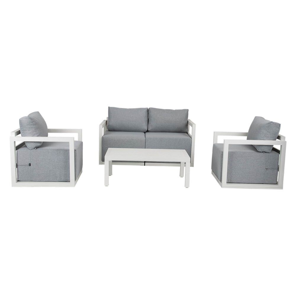Accommodate for four people and is equipped with a rectangular shaped coffee table for you to place some drinks, snacks, or decorations. Made of powder-coated aluminum in the colors white or charcoal grey are easy to clean. Relax into the generous 40cm thicker cushions and enjoy entertaining in your garden.