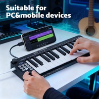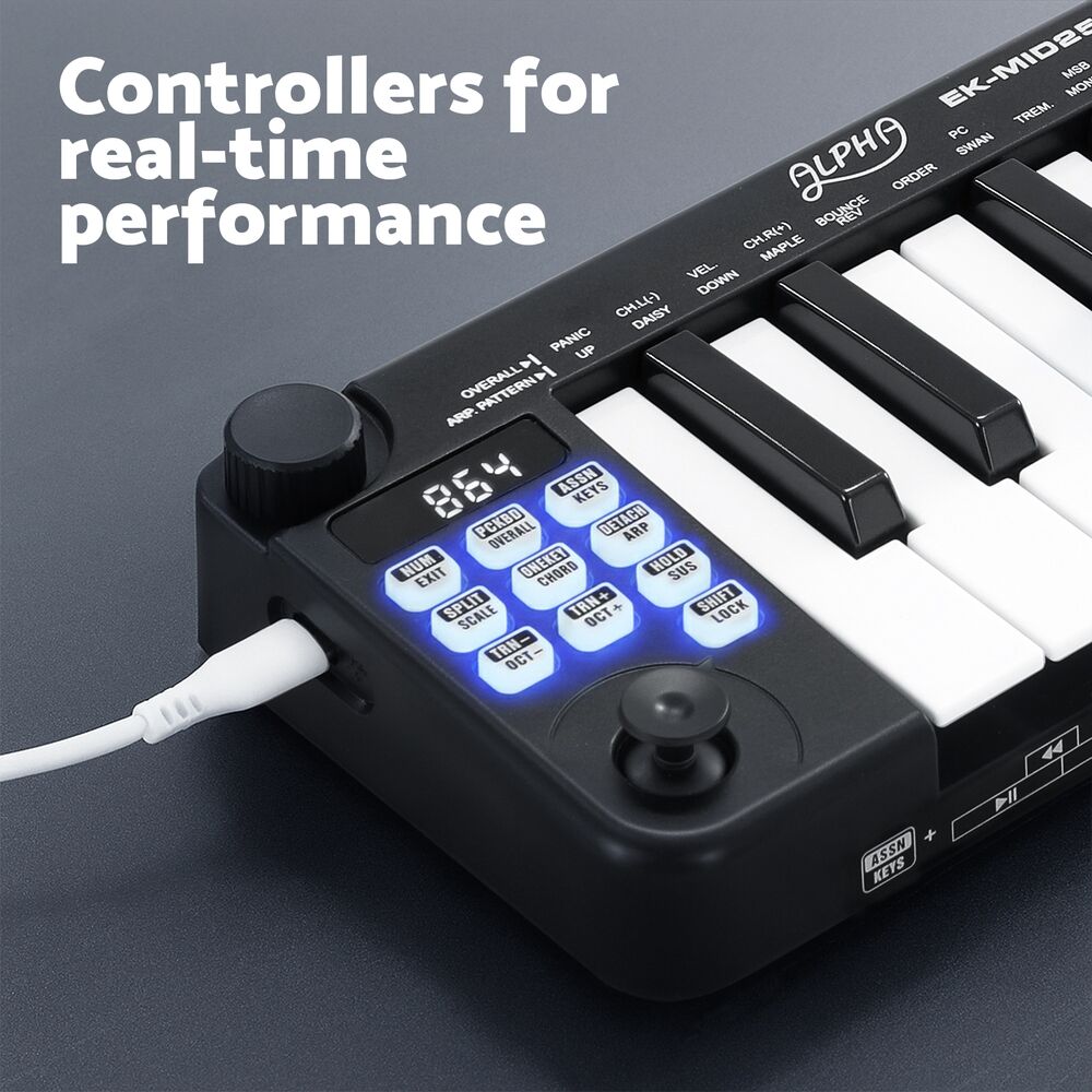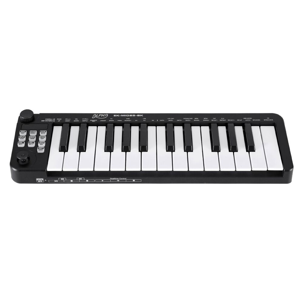 This Alpha 25-key portable MIDI keyboard is perfect for music production on the go. Featuring velocity-sensitive keys and a handy keyboard split function, it offers comprehensive control. The assignable knob and joystick enhance real-time performance. Creative features include one-touch chord, intelligent scale, and a built-in MIDI clock. This 25 key MIDI controller includes USB/MIDI combo power, transport control, and a 3-digit LED display. Its compact size (360 x 105 x 35 mm) makes this USB MIDI controller for laptop use an essential tool in Black.