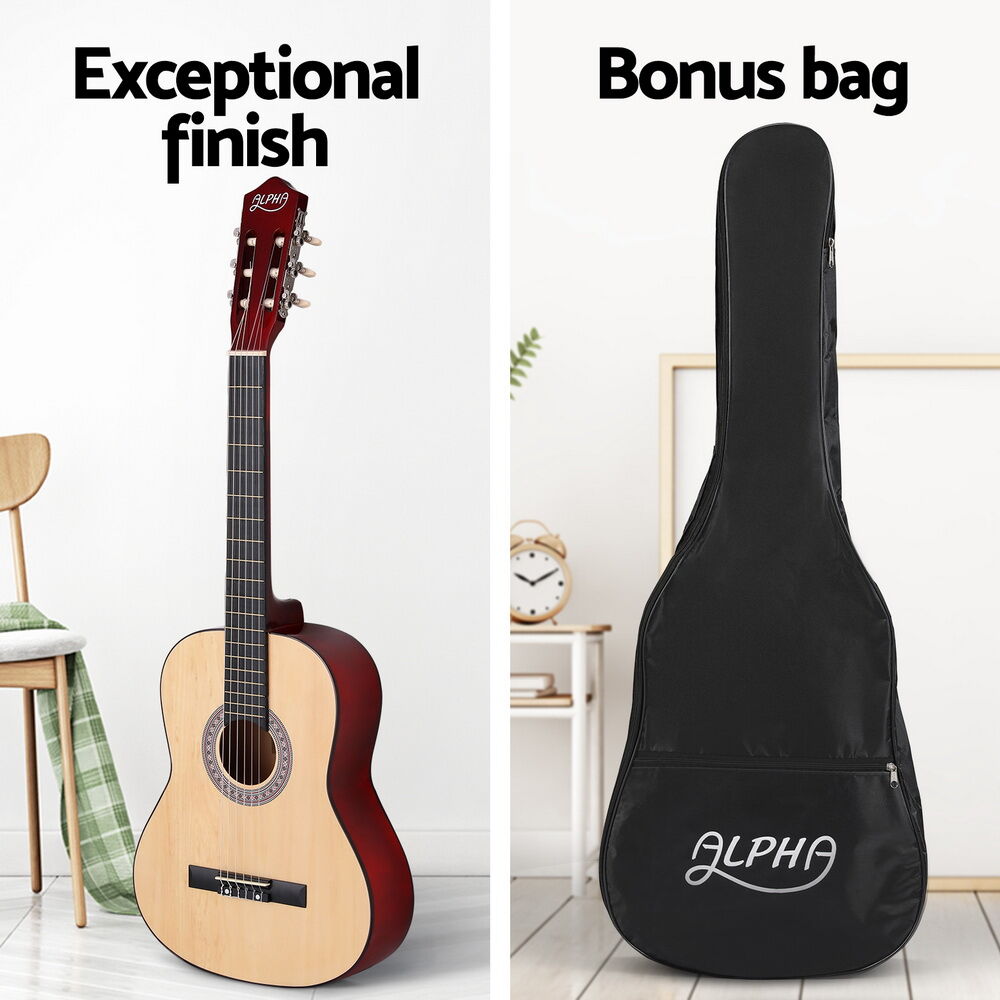 $91.17It is heaps of big fun with our Alpha 39-inch Classical Guitar. Ideal for beginners alike, the guitar makes for easier handling or learning for anyone. Sitting out on the porch playing guitar and singing with your mates or even going away sitting around the campfire and singing in harmony is definitely enjoyable and fun. Crafted from the fine tonewoods, the guitar is made of laminated linden for its top, back, and sides. With an Okoume neck and plastic fingerboard, the guitar also delivers great tones and timbre to create some beautiful music. The delicate process of manufacture includes durable bracing and meticulous finishing techniques that guarantee this guitar is a real joy to play. Strum on!