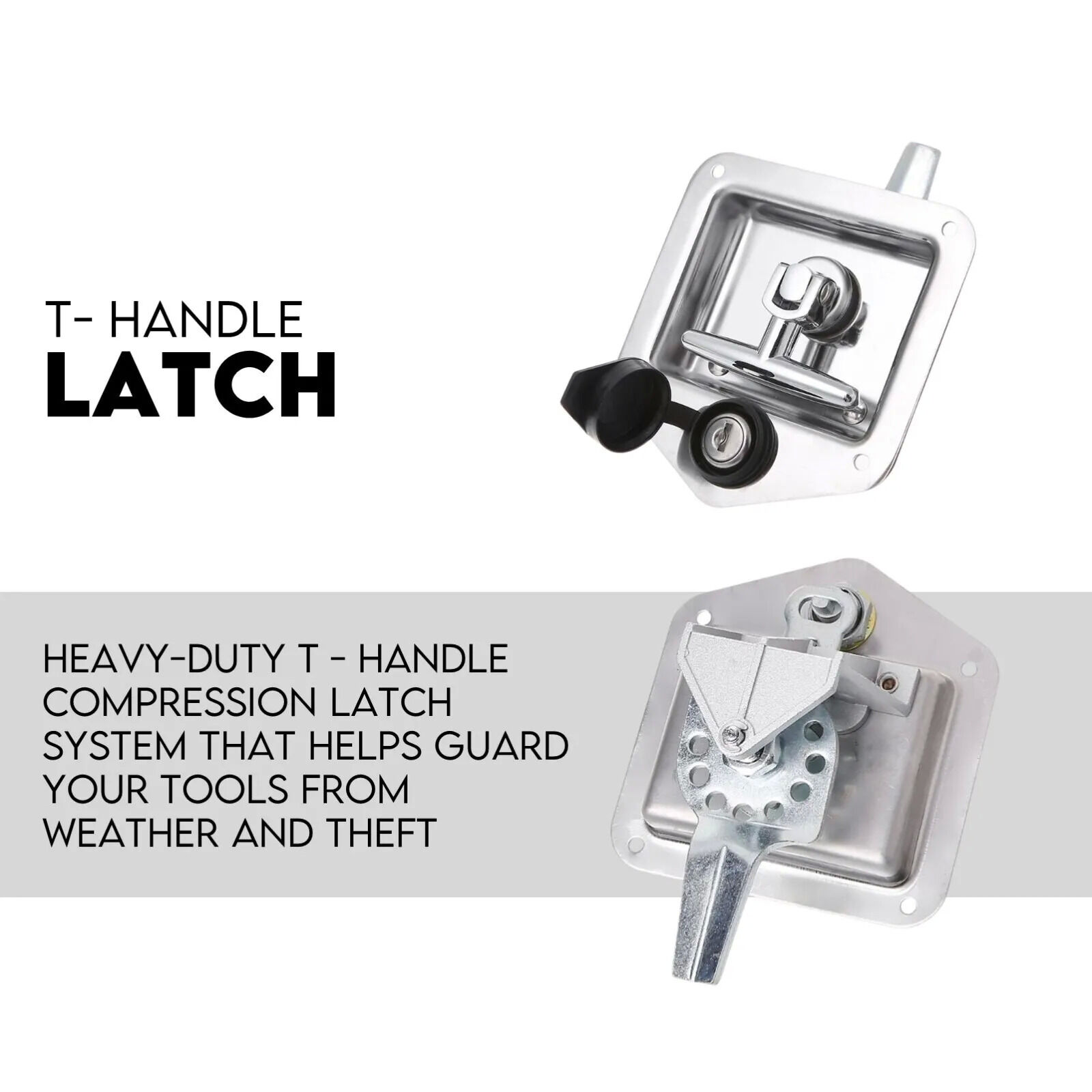Additionally, it features a heavy-duty T-handle compression latch system for enhanced security against theft and weather.