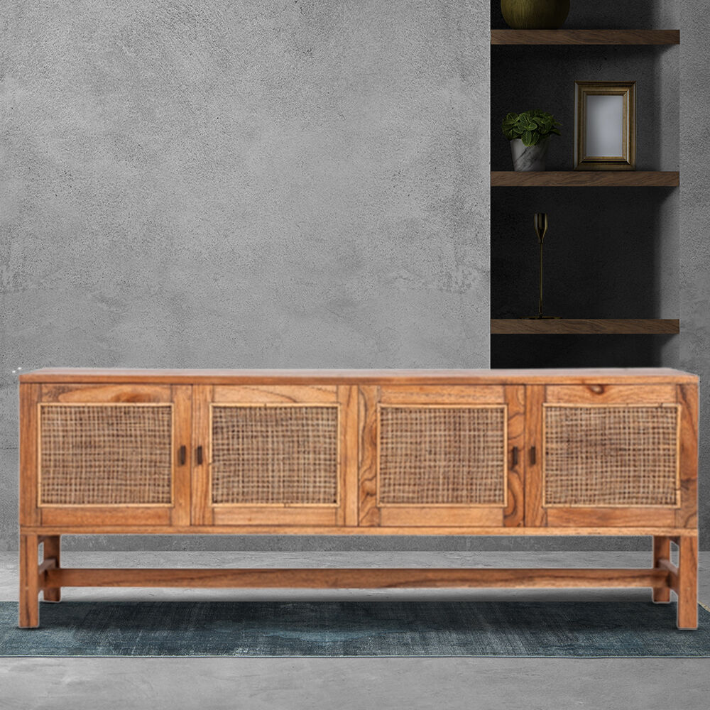 Give your entertainment space a beautiful look with this eco-friendly TV unit. It is designed in a Bohemian style, with fibrous whiskers, bumps, slight cracks etc. as natural features, that looks great with modern entertainment devices. The TV unit would substantially increase storage space because it has 4 doors and plenty of shelf space, intelligently divided into 4 compartments. This solves your living room's storage space problem. The TV unit is made of sustainably harvested solid Mindi wood and its storage units have attractive webbing on the front part. Mindi wood is known for its strength, durability, and resistance to decay caused by mould or moisture. The light tobacco finish allows it to blend nicely with a variety of interior decor trends. The fully assembled TV unit comes with a one-year warranty.
