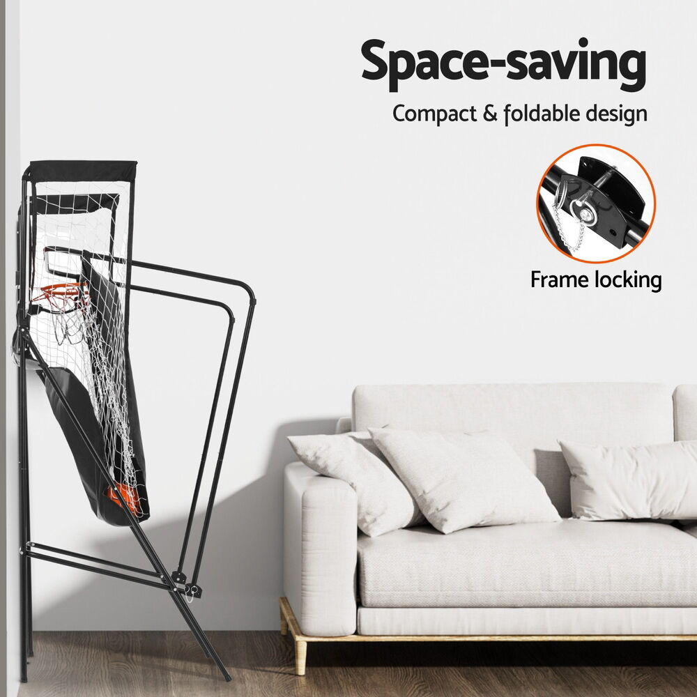$115.61Bring the thrill of the arcade home with your very own Basketball Shooting Machine. The game is made from quality coated steel tubes that are rust-resistant as well as a waterproof and stain-resistant printed polyester fabric that is sturdy and durable, so you can use it indoors or outdoors. Realistic sound effects make you feel like youre at your local arcade hotspot. The LED automatic score counter provides an accurate and impartial referee for two players, no fighting on the courts! The high net catches stray balls and returns them quickly and easily so you can get back to fun. The triangle frame design, secure lock and anti-slip feet always keep the game stable. With a foldable, portable and easy-to-assemble Velcro design, you can play basketball in minutes, whether at home or on the road. Includes two additional basketballs so you can keep shooting for the stars, no interruptions! Game on to victory with your very own arcade-style Basketball Shooting Machine.