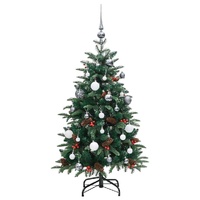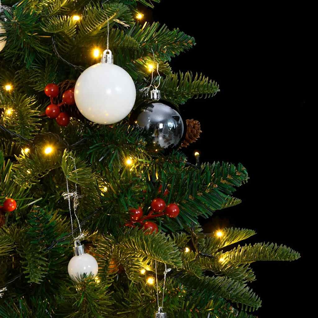 Comes with beautiful holiday decorations, this artificial hinged Christmas tree with LEDs will be eye-catching in the evening and create just the right atmosphere for this Christmas. Hinged construction: The Christmas tree has a hinged construction, so the branches will automatically fold down at the right angle. This will make it much easier to put up the tree in the perfect shape and will save you time as well.8 lighting modes: The LED string light has 8 different lighting effects (combination, in wave, sequential, slow glow, chasing/running water, slow fade, twinkle/flash, and steady on). You can switch the lighting modes by pressing the button on the USB to create different holiday atmospheres.Lifelike PE tips: The artificial Christmas tree has realistic PE tips, made by injection moulding, giving the tree a more natural appearance.Beautiful decoration: The modern Christmas tree has cones and red berries on it, creating a lovely natural look. These shiny Christmas balls are available in three different sizes, which bring more possibilities for your DIY decoration.Sturdy stand: The metal stand provides your Xmas tree with optimal sturdiness and stability. Good to know:We recommend setting aside 30-45 minutes after assembly to properly shape the tree by peeling back the branches and pulling the tips apart to give the branches a more full-bodied look.The product has a USB connector that requires a certified 5V USB power source (not included).Please ensure that the USB connection is plugged in a dry environment.