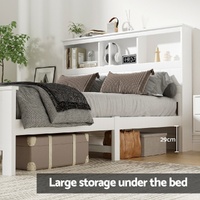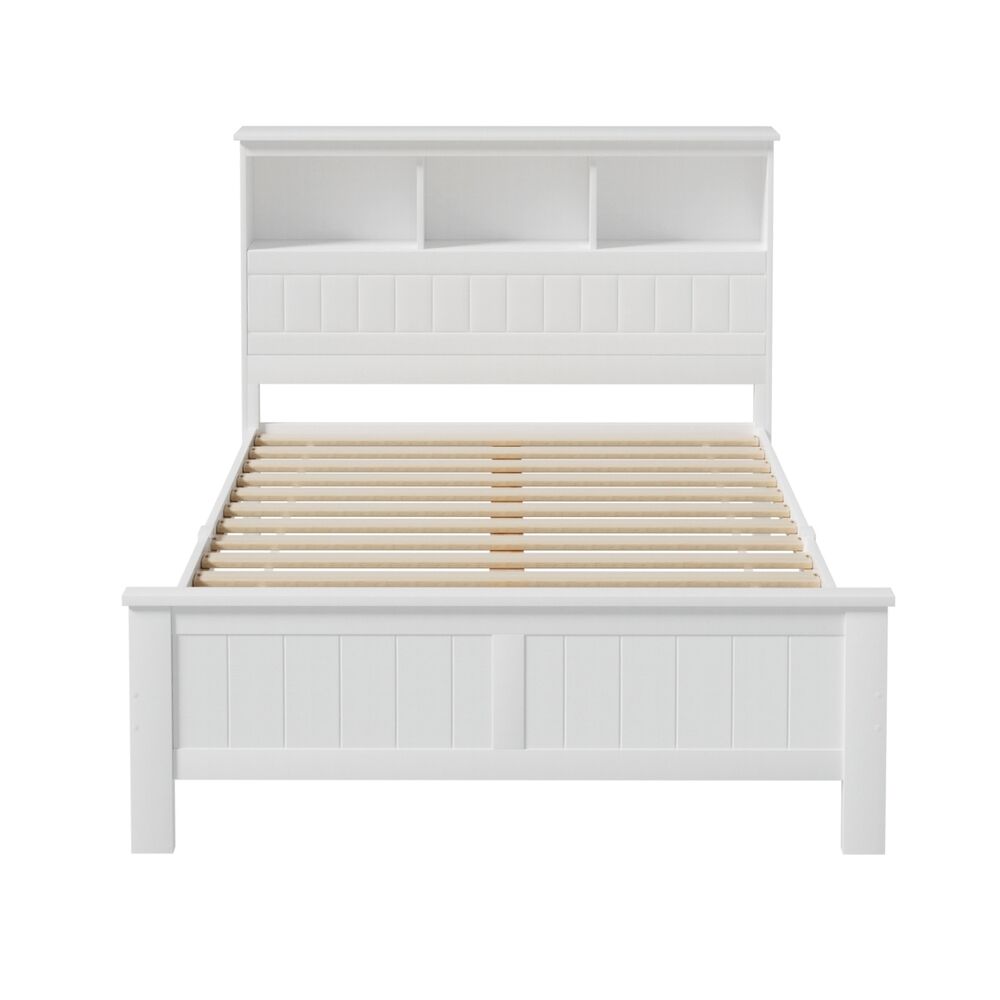 NOW $326.66Made of natural pine wood, the Artiss Conqueror Bed Frame is ideal for kids as it for any adult. Strong and sturdy, the bed frame comes with a solid plywood slated base, reinforced supports across the frame, heavy-duty steel fixings and smooth edges all round. Finished in a non-toxic, eco-friendly white paint, the neutral coloured bed frame is also very practical with ample storage from a headboard that comprises three open compartments and a closed shelf that folds down as well as more room beneath the bed frame for optional trundle drawers or any storage boxes. Fact it, this charming bed frame is designed to please in more ways than one.