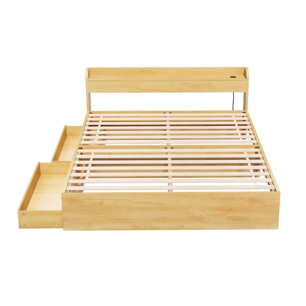 NOW $322.16It's easy to sleep well on the Artiss Aura Bed Frame. Made from thick 15mm and 18mm particleboard with 12mm plywood slats and a wood paper finish, the bed frame is designed for long-lasting use and longer-lasting sleep. The thick plywood slats and centre beams provide total support, and noise-free use, and improve the life of your mattress. It features a multifunctional design that allows you to use the bed for storage and to charge your phone overnight. Two drawers with smooth castor wheels can be installed on the left or the right for convenient storage. The headboard has smooth edges and plenty of room for your bedroom essentials. It also features two USB charging ports connected to a 200cm cable for convenience. While you power down for the night, you can power up with the Aura Bed Frame from Artiss.