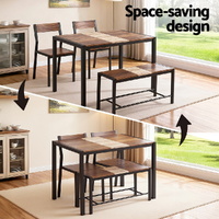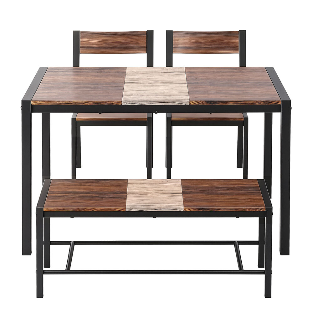 The set includes a spacious tabletop, two stable chairs, and a comfortable bench, easily seating four people. The surfaces are finished in a modern, multi-toned design featuring Rustic Brown, Beige, and Black accents for a contemporary look.