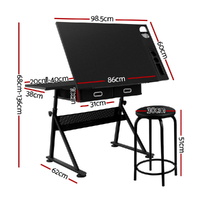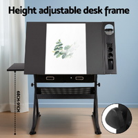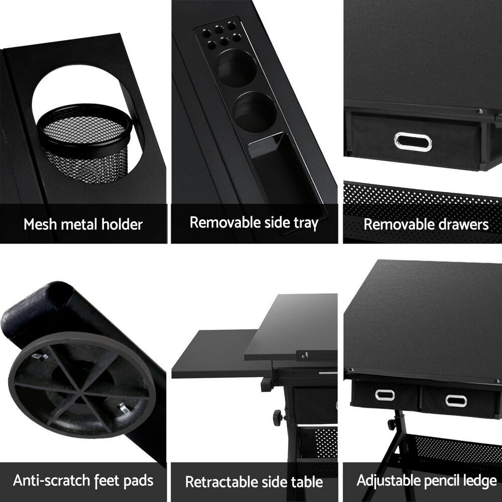 With its wide MDF board desktop and an apron edge, the Drawing Desk is assured of safe use with utmost functionality. Better still, under the main top is an extra slide-out table to extend your working zone. The removable side pigment shelf and drawers, and a hollow metal shelf also help to provide useful working and drawing essentials storage. As for the frame, the black powder-coated finish steel-constructed structure is designed to be durable while the anti-scratch feet pads keep the Desk firmly in place. Not least, the Drawing Desk can be set at your preferred working angle and height for optimum efficiency and a padded leather stool included for comfort and style.