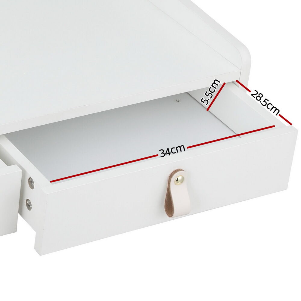 NOW $104.27Make mornings simple with the Artiss Daphne Dressing Table. Crafted from 15mm thick particle board and designed for long-lasting use, the wall-mounted vanity with a cloud-shaped mirror exudes elegance and a sense of ethereal beauty. The mirror comes equipped with an LED strip that features warm, neutral and daylight white colours so you can look great under any light. With the convenience of a USB cable, you can effortlessly charge your devices while indulging in your beauty routine. Designed with practicality in mind, this vanity table boasts two spacious storage drawers, providing ample space to organise your essentials. The anti-rust drawer runners ensure smooth and seamless operation, guaranteeing a hassle-free experience. Emphasising ease and convenience, this floating vanity table is not only easy to maintain and clean but also a breeze to assemble. With its sleek design and luxurious features, it is the perfect embodiment of opulence and functionality. Elevate your space with this remarkable piece and indulge in the ultimate luxury of the Artiss Daphne Dressing Table.
