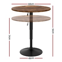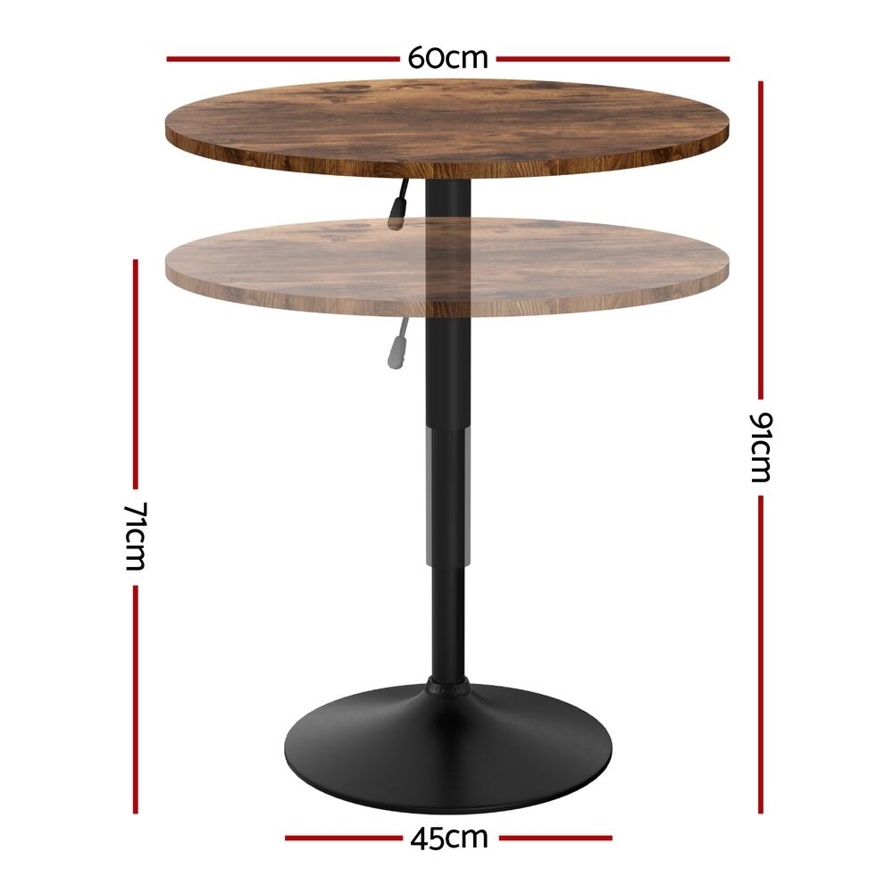 Elevate your space with the Artiss Adjustable Bar Table, combining sleek design and practical functionality. The 360° swivel base and gaslift mechanism allow effortless height adjustments from 71cm to 91cm, perfect for kitchen counters, outdoor patios, or home bars. Crafted with a robust steel frame and scratch-resistant MDF tabletop, this 60cm circular table offers ample room for drinks, decor, or workspace essentials. Its non-slip rubber ring and weighted 45cm base ensure stability on uneven surfaces. The rustic brown and black finish adds contemporary charm to any setting. Simple assembly and weather-resistant materials make it ideal for both indoor and outdoor use.
