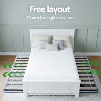 Experience the ultimate space-saving solution with the Artiss Elvis Trundle Bed. Perfect for homes with limited space, this innovative bed features a spare bed that conveniently slides out from underneath when needed—ideal for unexpected guests. Crafted from solid pine wood with quality timber slats, this bed ensures even weight distribution and durability. It is designed to fit Australian king single-sized mattresses, with a maximum thickness of 14cm for optimal comfort. Say goodbye to the hassle of extra accommodations with this practical and stylish trundle bed.