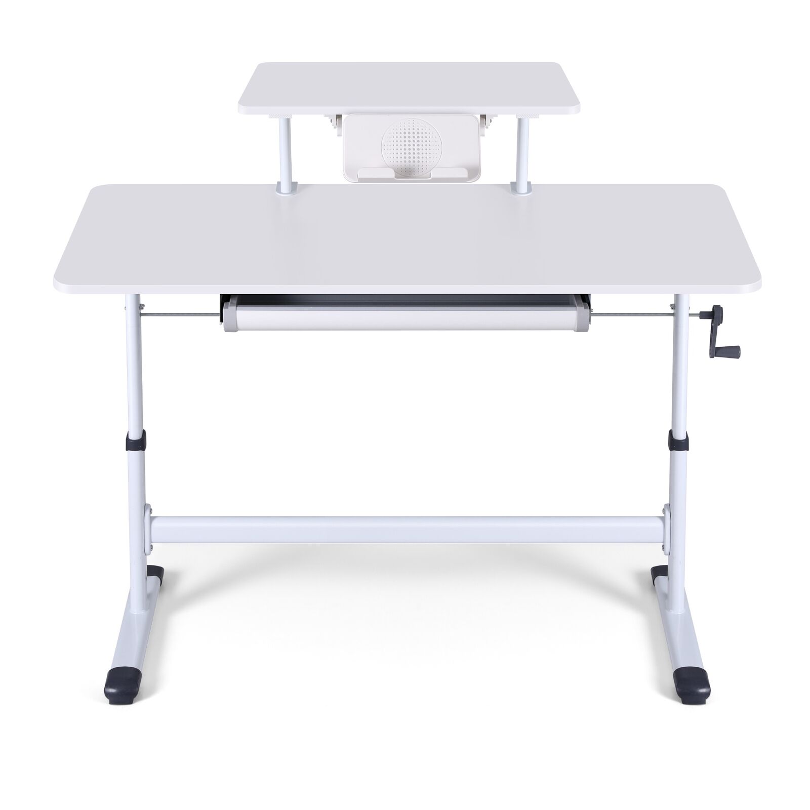 Create an organised and comfortabl study or workspace with this Artiss manual standing desk. Perfect as a study desk or home workstation, it features a smooth hand-crank mechanism for easy height adjustment. The built-in drawer helps keep supplies tidy, while the upper shelf offers extra space for books or decor. An integrated holder keeps your phone or iPad within reach. Supported by a sturdy brace, this adjustable desk provides reliable stability for your workday.
