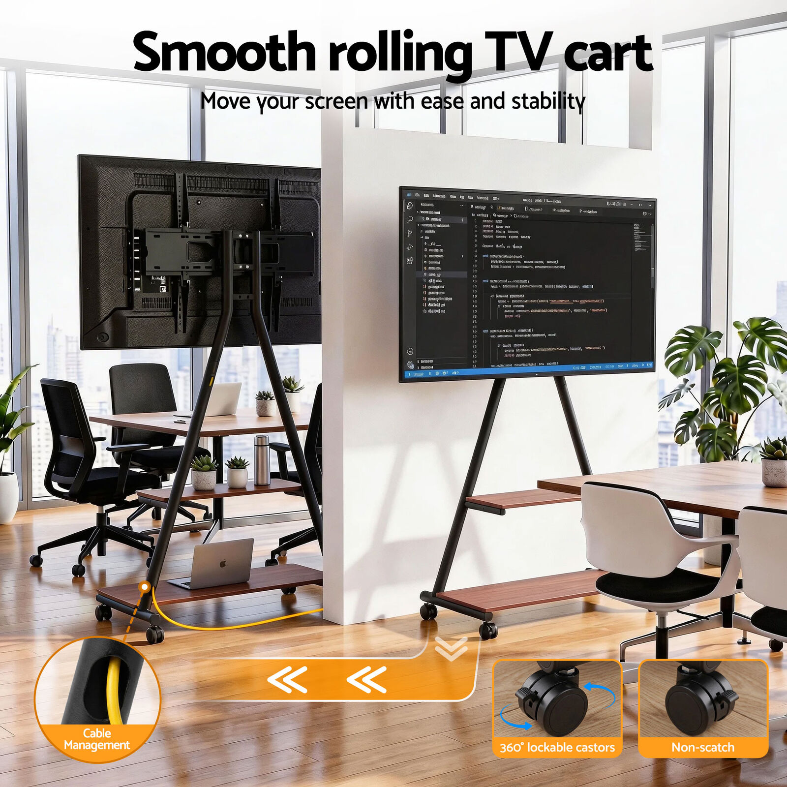 Enhance your viewing experience with the Artiss Mobile TV Stand, a sturdy and versatile solution designed for modern homes, offices and professional environments. Built with a durable steel frame, this freestanding stand securely supports TVs from 32 to 75 inches, with a maximum TV weight capacity of 68kg.The stand features a practical dual-shelf storage design with solid MDF shelves. The upper shelf supports up to 30kg, ideal for laptops, gaming consoles or media players, while the lower shelf holds up to 35kg for additional audiovisual equipment. Together with the TV mount, the entire unit offers a total load capacity of 133kg.Designed for flexibility, the stand moves easily between rooms with smooth-rolling caster wheels, while built-in locks help keep it stable when positioned. The adjustable mounting bracket provides multiple height levels, a ±40° swivel and a ±12° tilt to help achieve a comfortable viewing angle and reduce screen glare.Compatible with VESA mounting patterns up to 600mm x 400mm, the stand also includes an integrated cable management system to keep wires neat and organised. Combining strength, mobility and practical storage, the Artiss Mobile TV Stand is a reliable choice for living rooms, offices, meeting spaces and conference rooms.