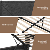 This Artiss Queen bed frame combines smart storage solutions with modern convenience. The gas-lift mechanism reveals spacious concealed storage underneath, while the geometric fabric headboard features an open shelf and integrated charging station (2 outlets + USB/Type-C ports). Engineered with sturdy plywood slats and a charcoal grey upholstered platform, it offers both style and functionality. Includes certified electrical components for safety.
