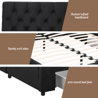 Elevate your bedroom with the Queen upholstered bed frame. This Queen bed frame combines premium velvet fabric with pine wood construction for lasting durability. Maximise space with three wheeled storage drawers – two bedside, one oversized foot drawer. The integrated charging station features SAA-certified sockets, USB and Type-C ports for convenient device powering. Engineered with reinforced bent plywood slats and smooth-gliding rollers, it offers effortless storage access. Perfectly sized for Australian bedrooms, this storage bed with charging functionality blends practicality with contemporary style.