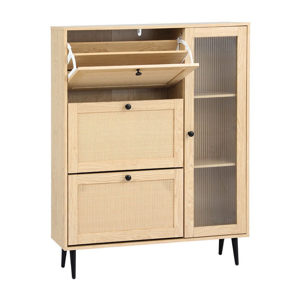 Keep your shoes organised and your space stylish with the Artiss Shoe Rack. Featuring 3 flip-out drawers and 3 shelves with a chic fluted glass door, this shoe rack combines functionality with a modern design. The faux rattan front door adds a touch of texture, while the sturdy particle board with paper veneer ensures durability.