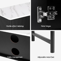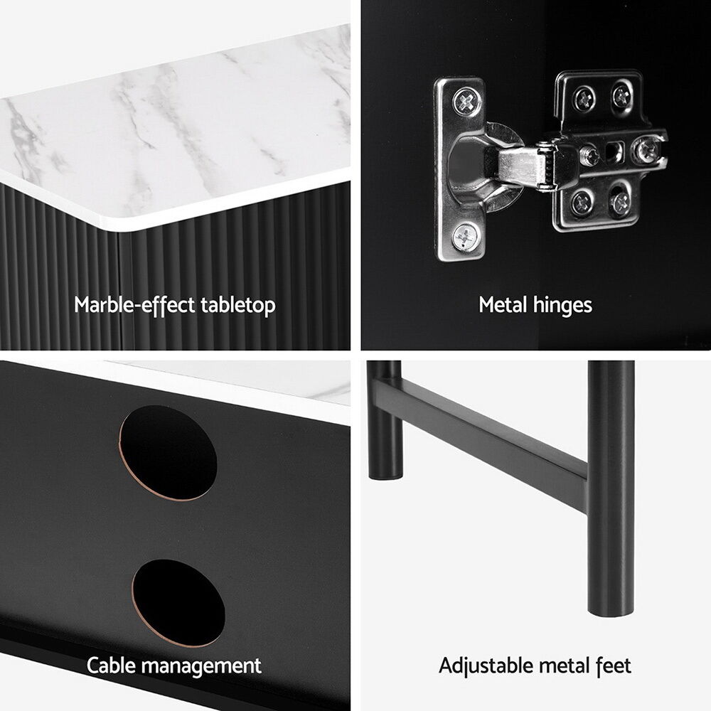 Introducing the Kaisu Entertainment Unit, a stylish and functional addition to your living space. This unit features a marble-effect tabletop, two cabinets with reeded door panels and two open shelves, adding a touch of elegance to its design. With its sturdy construction and adjustable metal legs, it not only provides durability but also adds a modern flair to your room. The Kaisu Entertainment Unit is not only aesthetically pleasing but also practical. It comes with floor protectors to prevent any damage to your floors and cable management to keep your wires organised and tangle-free. With its high weight capacity, you can confidently store your entertainment devices and accessories. Assembly is a breeze, making it easy for you to set up and enjoy your entertainment area in no time. Entertain in style with the Kaisu Entertainment Unit from Artiss.