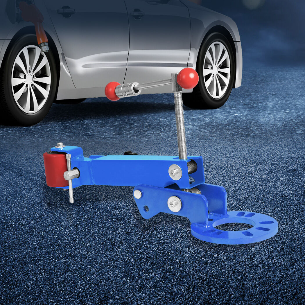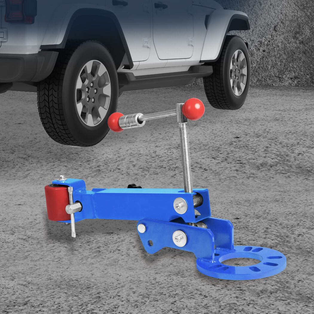 Jack the car up. Ease the wheel off. Insert your fender-rolling roller. Bolt it on. Remove any casing. Adjust and get to rolling. Start gently and work out the right angle to roll on.