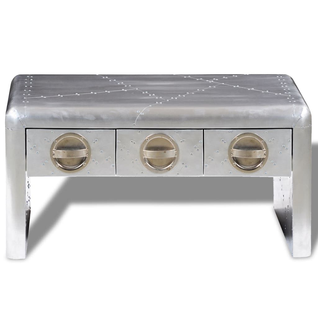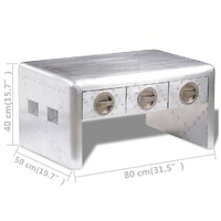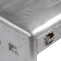 This high-quality aviator coffee table can be placed in any room. Thanks to the sleek and compact design, it can also be used as a side table, a bedside table, an end table, etc. This aircraft coffee table has three drawers for small items like keys, notepads, pens, and other knick-knacks. The tabletop can be used to place food or drinks or to display decorative objects like photo frames, or even potted plants. This airmen coffee table is made of solid wood and its surface is clad with a patchwork of polished aluminium panels, accented with exposed steel screws, which makes it extremely durable. Smooth edges and the retro drawer handles give the aviator coffee table a unique look.