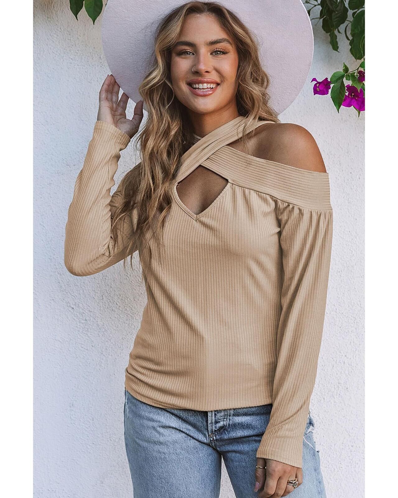 • Cut Out Criss Cross Cold Shoulder Ribbed Top