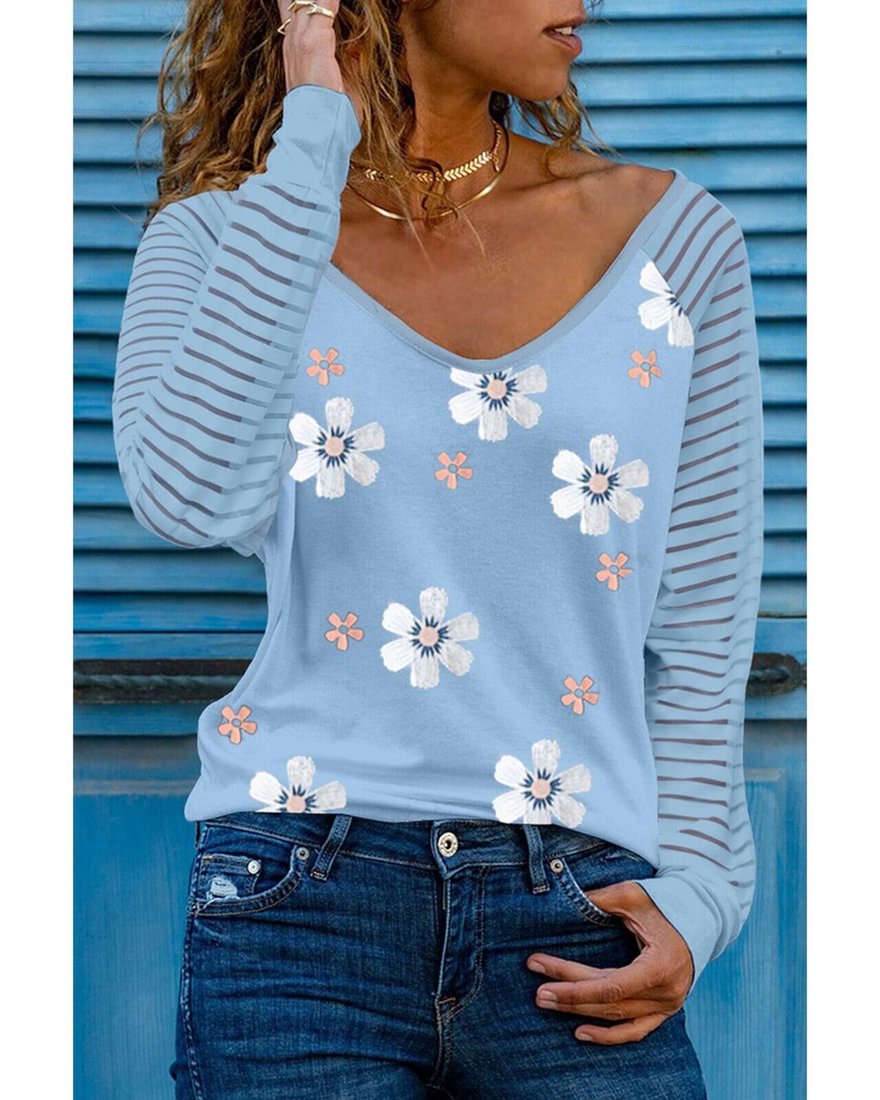 Azura Exchange Daisy Print Mesh Patchwork Long Sleeve Top