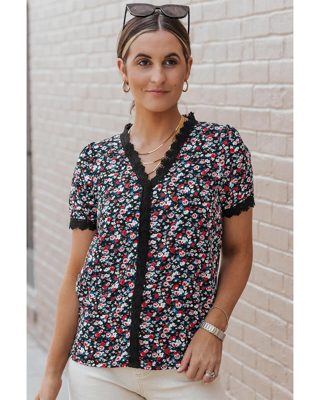 • Multicolor Ditsy Floral Lace Trim Casual Blouse