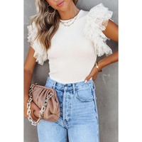 • Luxurious Beige Dotty Mesh Ruffle Sleeve Ribbed Knit Top