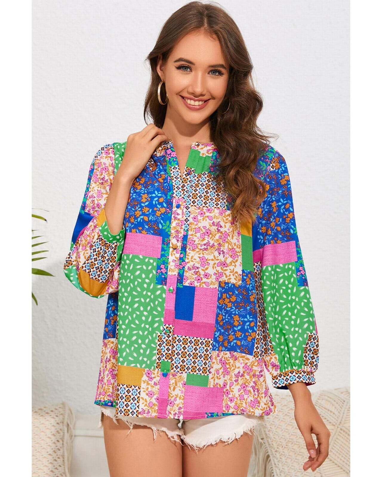 Azura Exchange Floral Patchwork Print Puff Sleeve Shirt