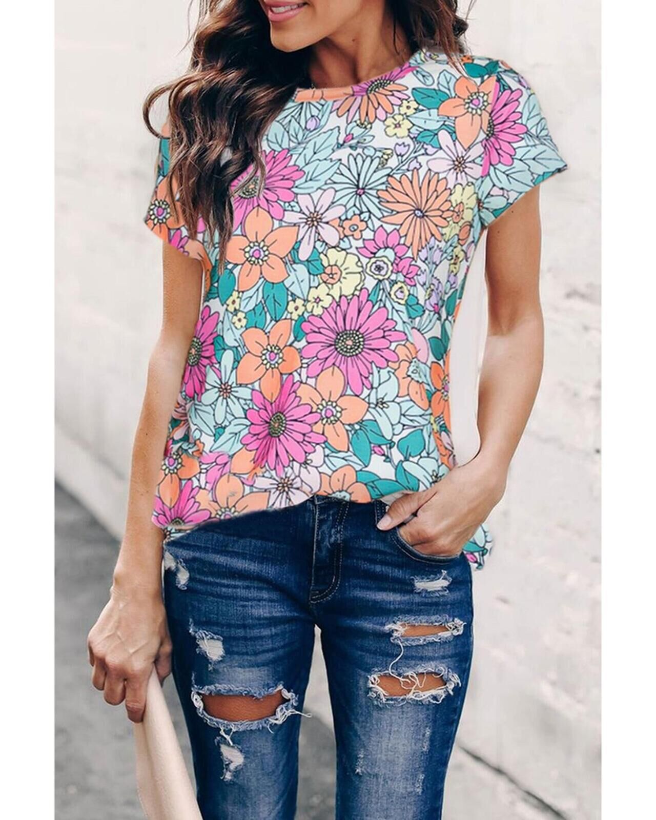 Azura Exchange Floral Print Asymmetric Hem Short Sleeve Top