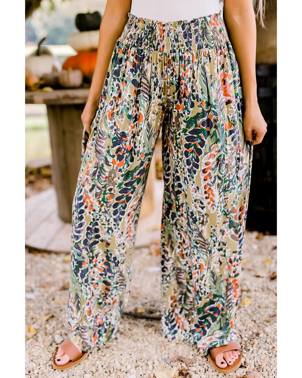 Azura Exchange Floral Print Shirred High Waist Wide Leg Pants