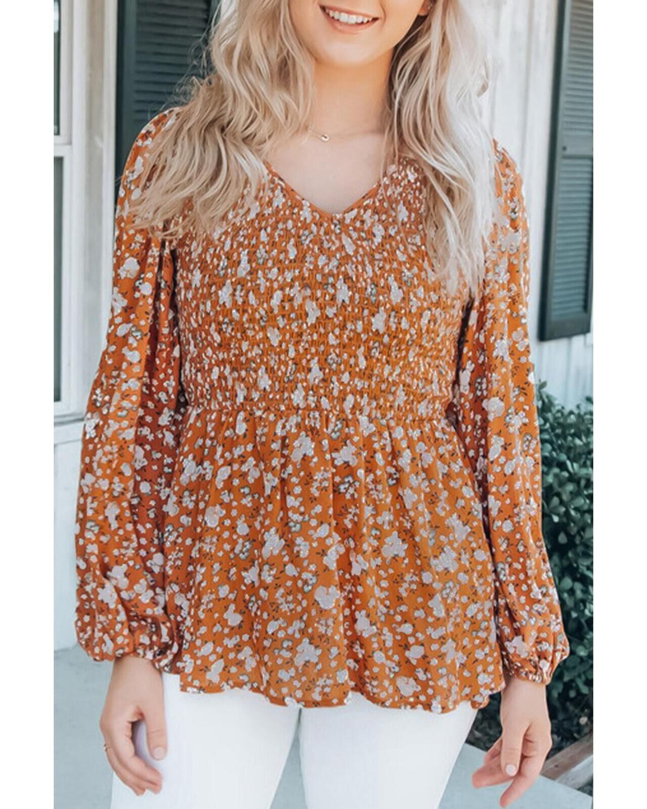 Azura Exchange Floral Print Shirred V Neck Blouse