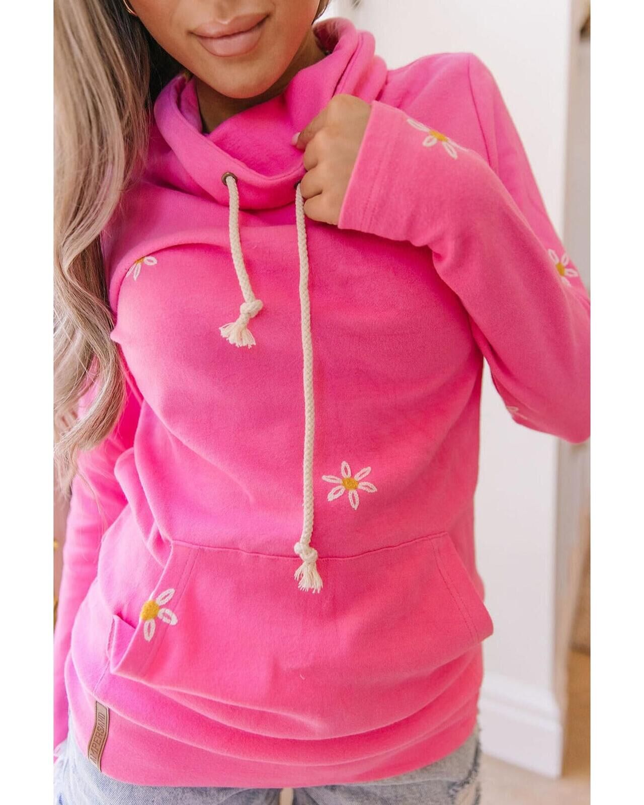 • Pink Flower Embroidered Thumbhole Sleeve Cowl Neck Sweatshirt