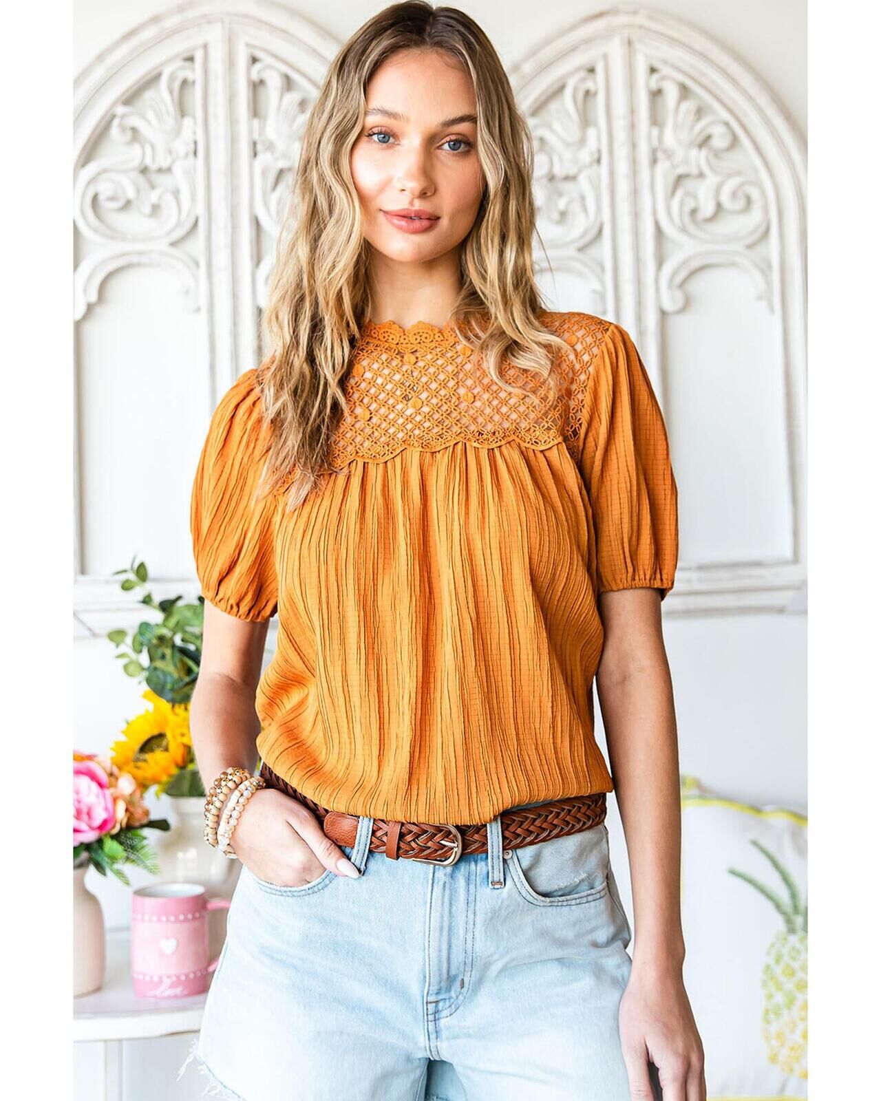 • Luxurious Textured Crochet Keyhole Puff Sleeve Blouse