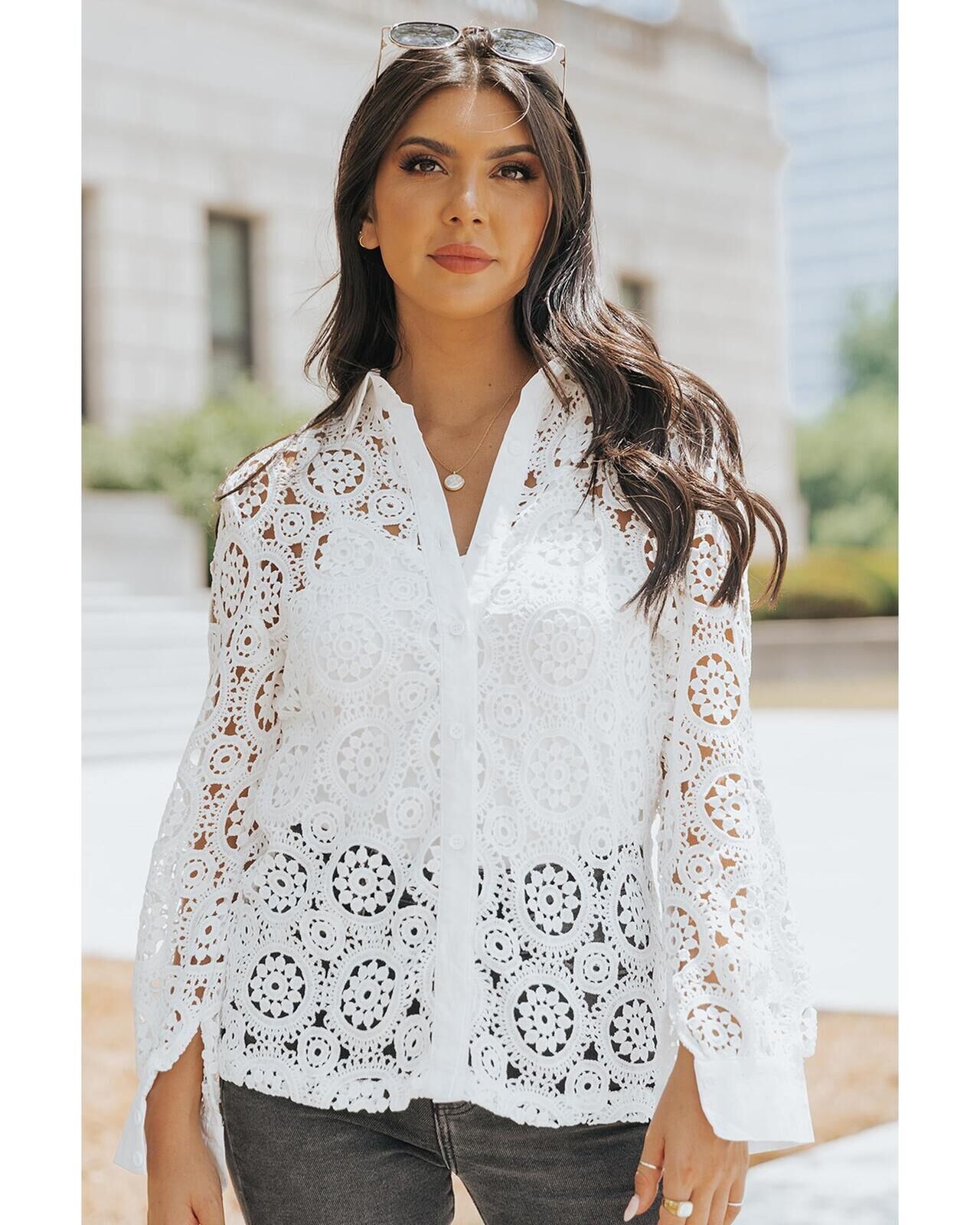 • Stylish and elegant Crochet Lace Hollow-out Turn-down Collar Shirt