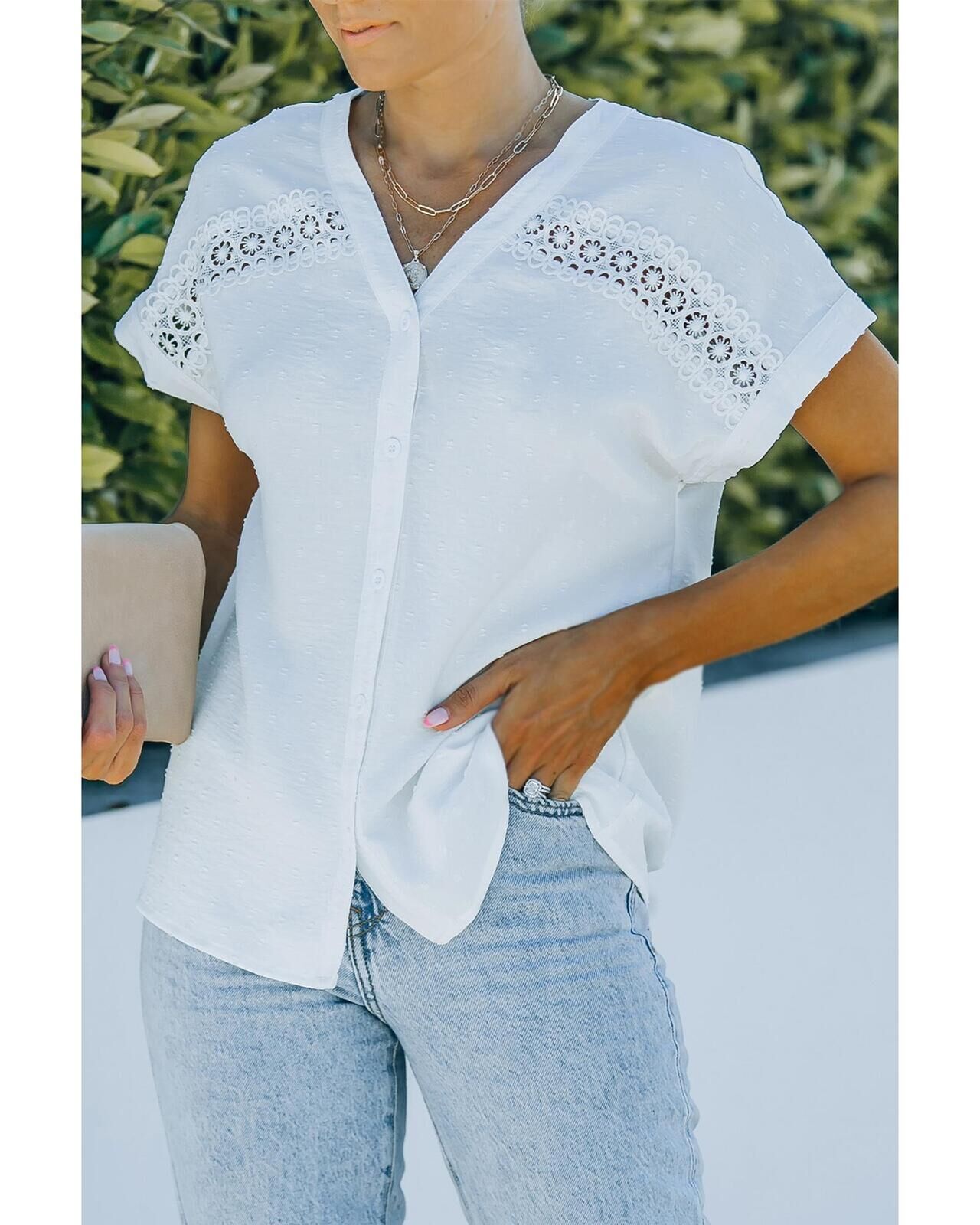 • Luxurious Swiss Dot Lace Splicing Buttoned Short Sleeve Shirt