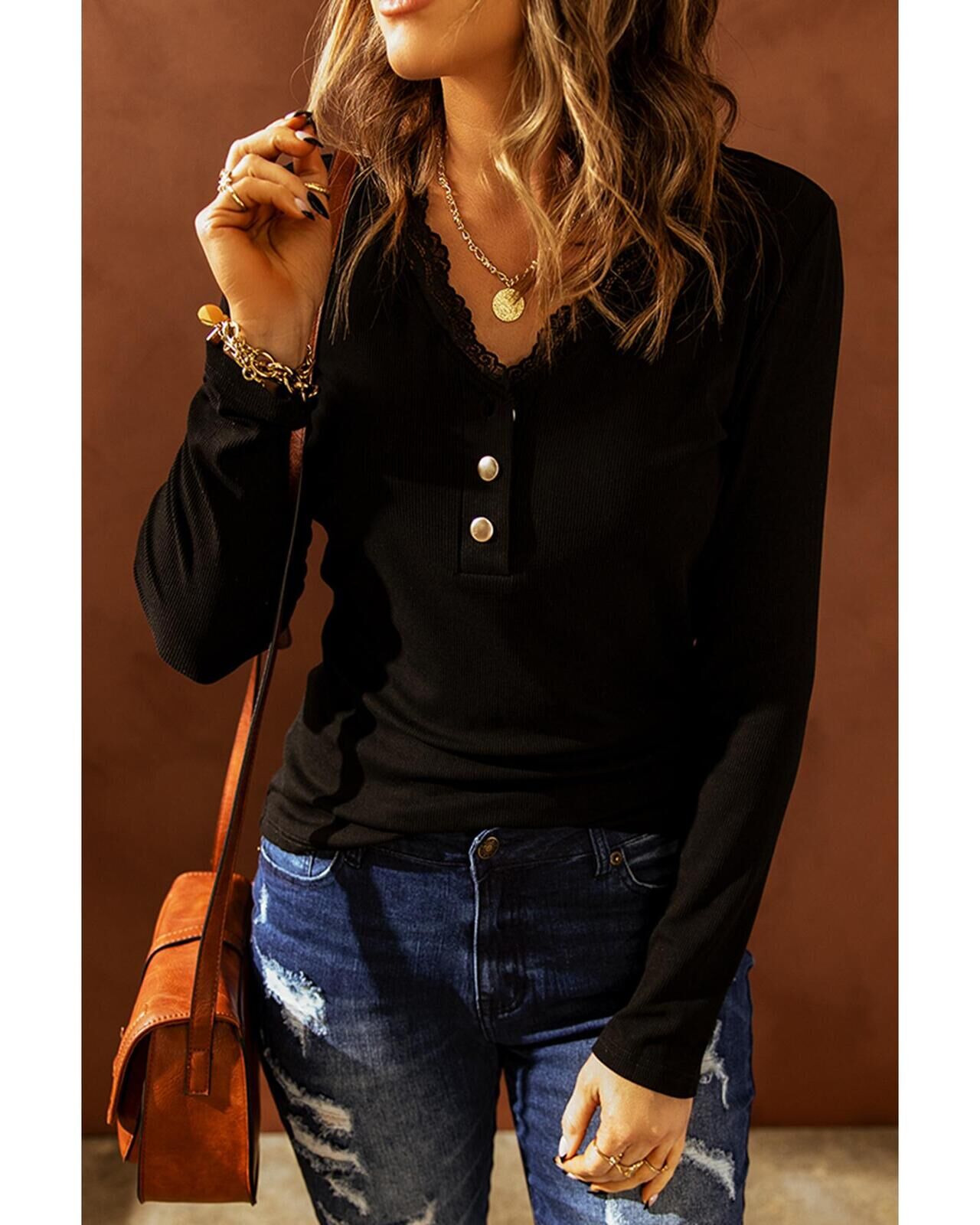 • Lace Splicing Buttons V Neck Long Sleeve Top
