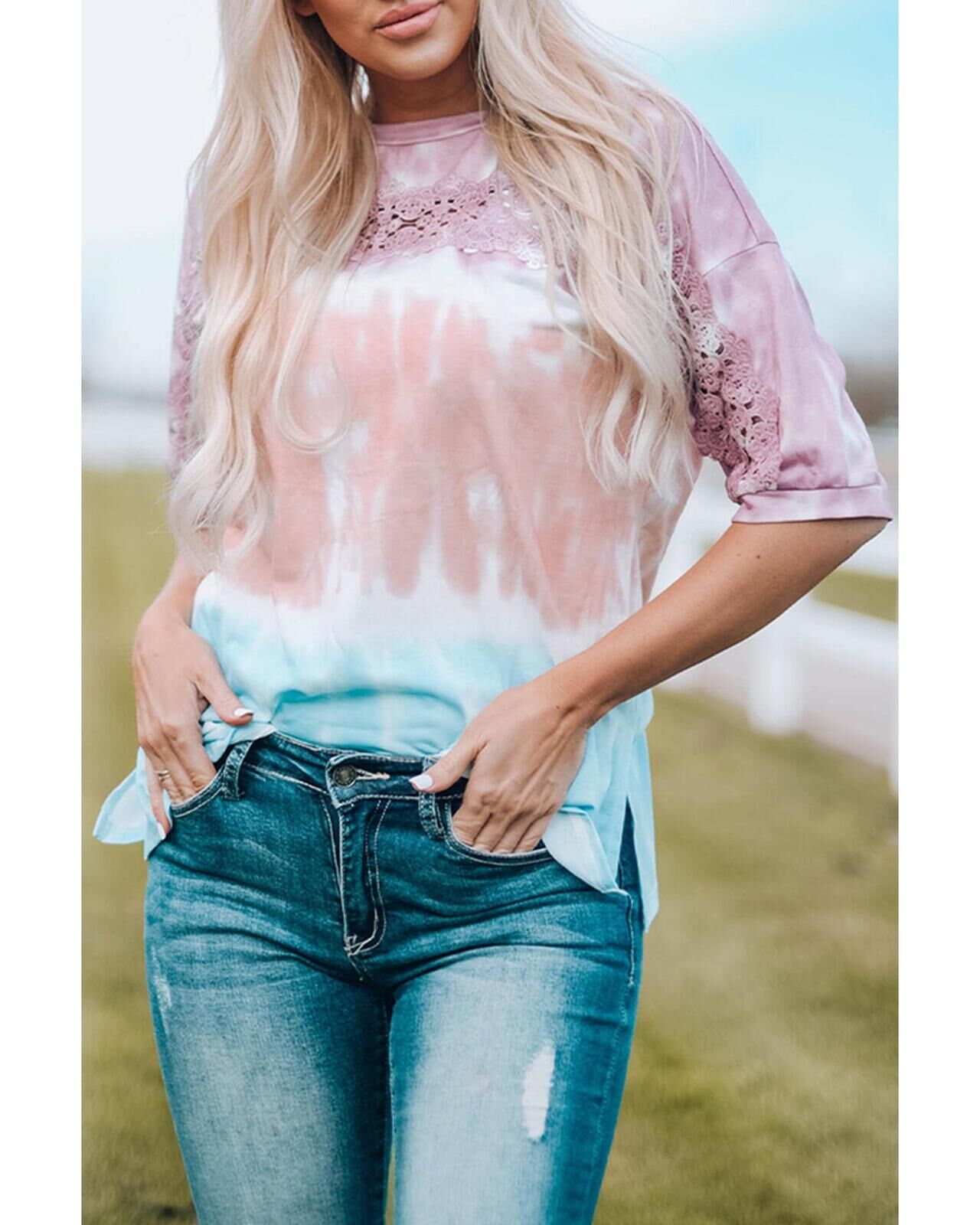 Azura Exchange Lace Stitching Tie-Dye Short Sleeve T-Shirt in 95% Polyester+5% Elastane